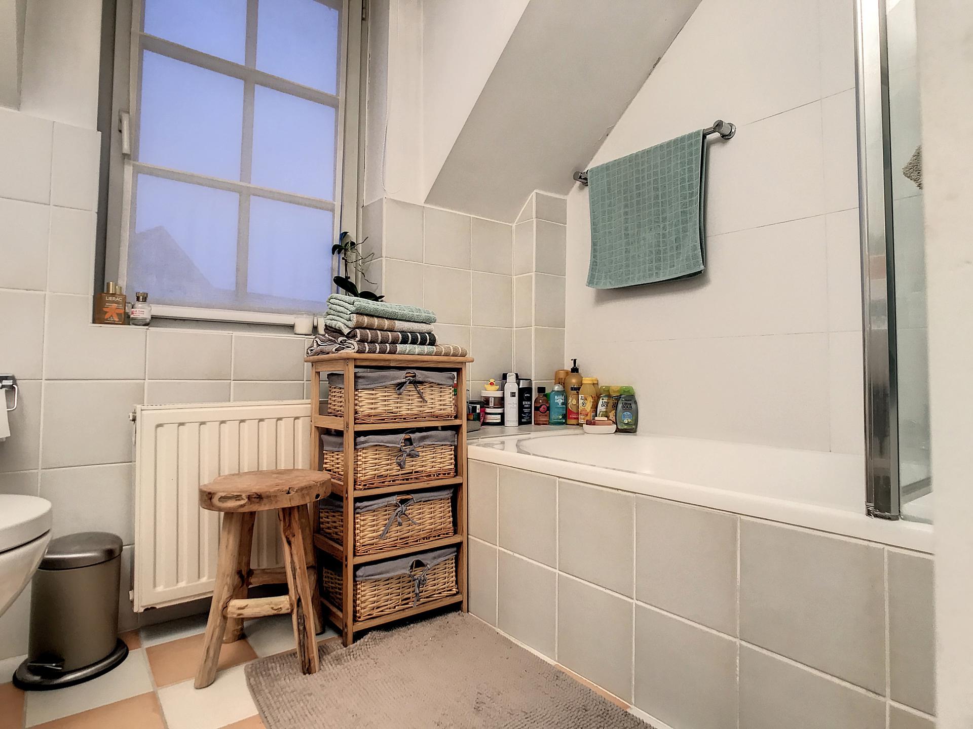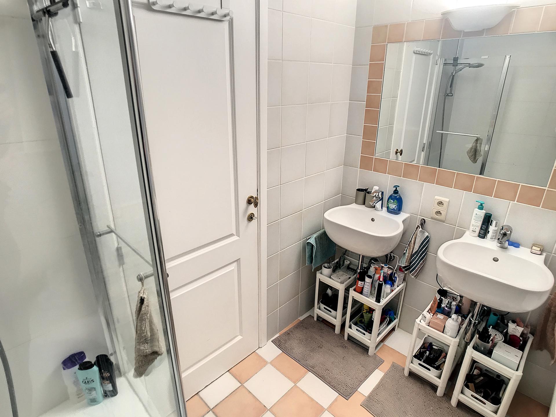 - SALLE DE BAIN : ± 5 m² comprenant baignoire, 2 lavabos, wc/Carrelage
